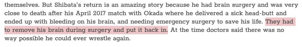 "But Shibata's return is an amazing story because he had brain surgery and was very close to death after his April 2017 match with Okada where he delivered a sick head-butt and ended up with bleeding on his brain, and needing emergency surgery to save his life."